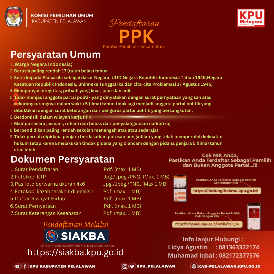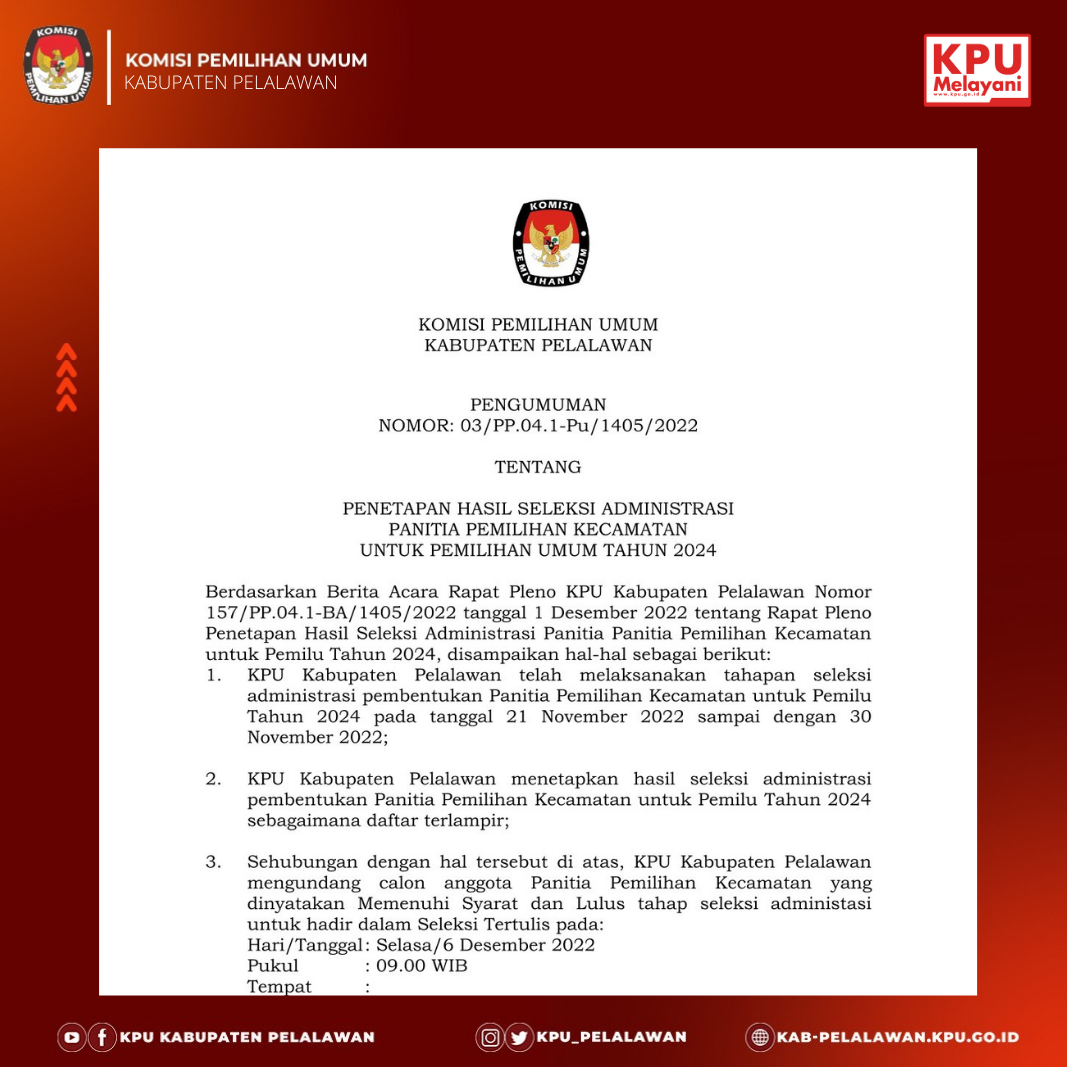 pengumuman ini memuat nama-nama calon anggota PPK di setiap Kecamatan di Kabupaten Pelalawan, juga jadwal tes tertulis serta syarat untuk mengikuti tes.