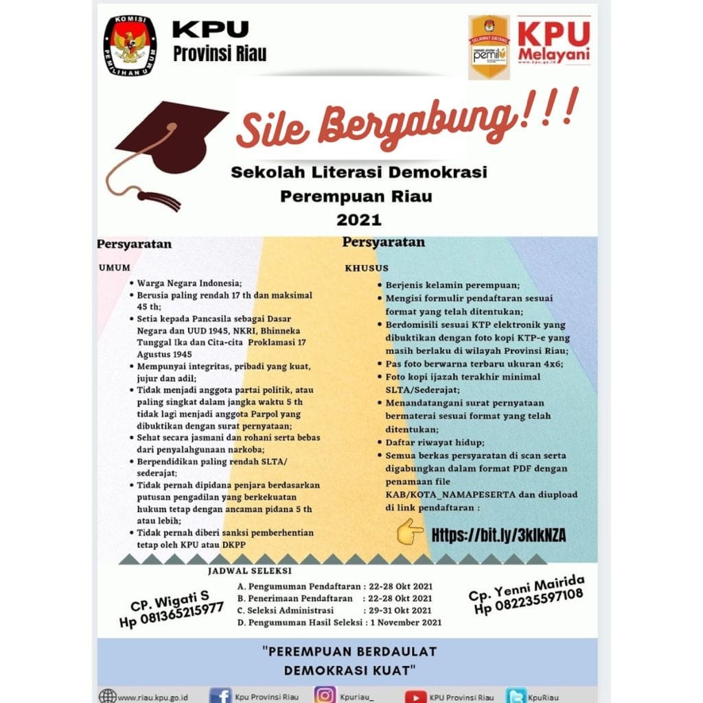 Kegiatan akan diikuti oleh 240 orang perempuan se-Provinsi Riau, dengan kuota 20 orang setiap Kabupaten/Kota. Peserta yang berminat dapat mendaftar melalui tautan berikut https://bit.ly/3kIkNZA. Untuk kelengkapan formulir pendaftaran dapat diunduh pada https://bit.ly/3njY4mP. Informasi lebih lanjut dapat menghubungi no WA Wigati Iswandhiari 081365215977 dan Yenni Mairida 08223559108.